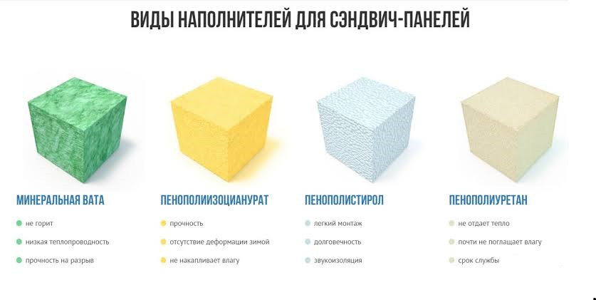 Что внутри сэндвич панелей? Сегодня большой популярностью пользуются такие виды наполнителей: мин вата, ППУ, стекловолокно, ППС. В зависимости от выбранного типа прослойки материалы могут отличаться по следующим характеристикам: