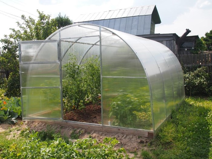 Конструкція проста в збірці, надійна і стійка. Рівномірний вигин полікарбонатного або плівкового покриття забезпечує рясне потрапляння сонячних променів. У таких теплицях можна вирощувати низько- і середньорослі культури. Арочна форма візуально розширює внутрішній обсяг. Навіть в конструкціях маленьких розмірів зручно працювати, зберігати інвентар і збирати урожай.